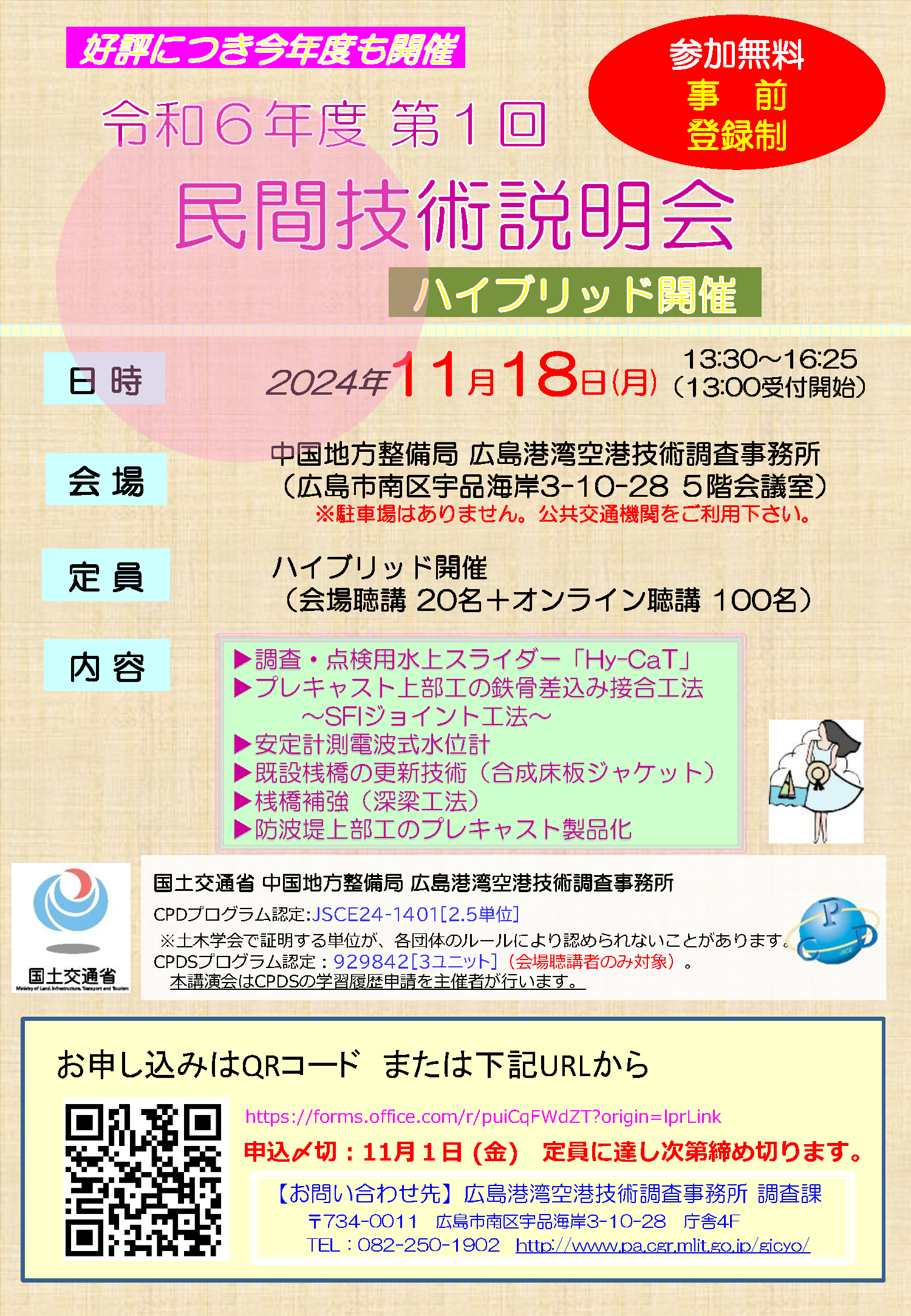 民間技術説明会は、中国地方整備局 広島港湾空港技術調査事務所が主催する技術説明会で、中国地方の港湾工事 、調査等で活用が期待される民間等で開発された新技術について情報収集や発信の場として開催しているものです 。