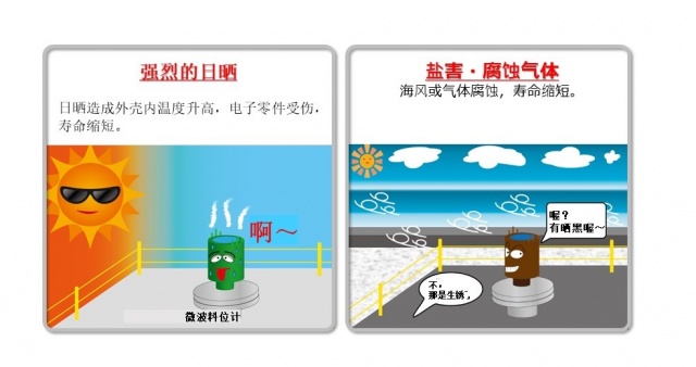 您是否有装设的仪器忽然故障,要花很多时间回复的经验? ・强烈的日晒 ・盐害、腐蚀气体 ・激烈的振动、连续的振动 ・强烈的噪讯