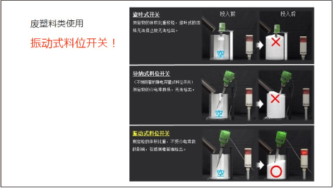 废塑料类使用 振动式料位开关! 当作发电厂的燃料所利用的废塑料类,因为低比重・低介电常数能检出的料位开关有限,而振动式料位开关不受借电常数的影响。