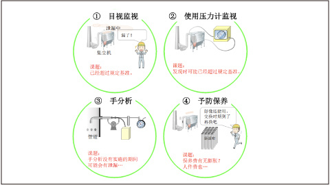 集尘设备的 泄漏预兆! 围绕着我们的环境问题日趋严重。 工场所排出的废气粉尘也是其中之一。 根据对策,课题也是若隐若现。