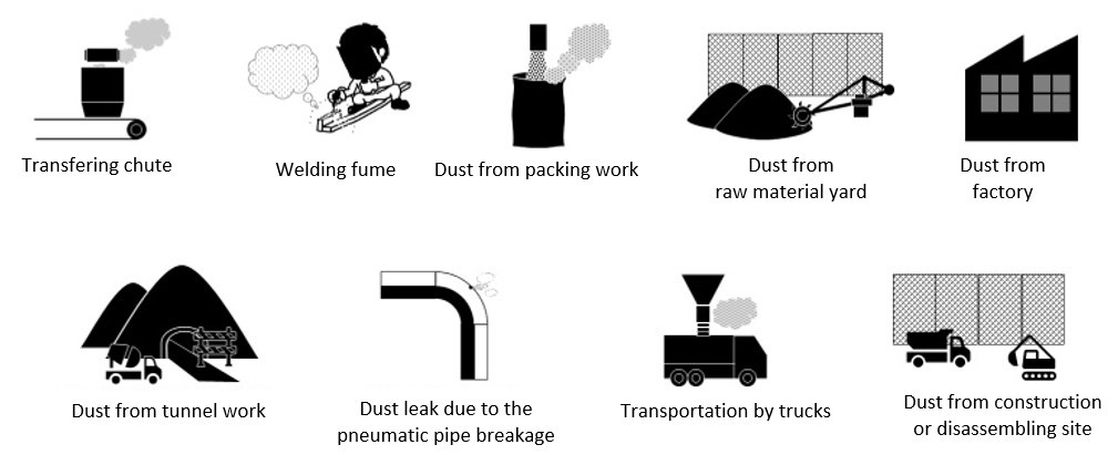 No matter how small the amount, the prolonged exposure to the flying dust would trigger various health problem. The one of the most serious disease is Pneumoconiosis. Pneumoconiosis takes many years to develop, however there is no fundamental treatment that makes a full recovery. Thus, implementing the proper health and safety measures are essential. The term “Pneumoconiosis” is defined as disease consisting mainly of fibrotic changes in the lung due to inhalation of dust in Japan’s Pneumoconiosis Law. The “fibrotic change” is irreversible changes that occurs when lung tissue is scarred and thickened due to the excessive dust inhalation. Aerosol is the extremely small particle of 0.001 to 10 micrometers, originating from natural source and anthropogenic source. It is also known to have an impact on our health and environment. For example, the aerosol produced by fossil fuel burning would cause serious air pollutions. It is strongly linked to the global warming and threatens human life at global scale.