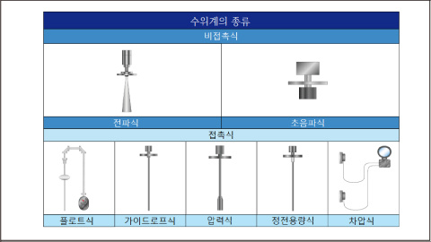 수위계로 사용되는 센서의 종류는 크게 접촉식과 비접촉식으로 나뉘며 접촉식은 플로트식·가이드로프식·정전용량식·압력식·차압식 등이 있으며, 비접촉식은 전파식·초음파식이 있습니다.