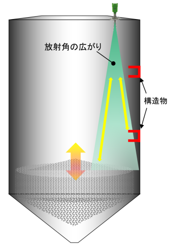 電波式レベル計を含む一般的な非接触式レベル計全般は方射角と呼ばれる広がりを持っています。