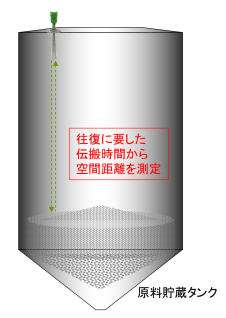 この反射波が受信されるまでの「時間」を「距離」に換算することで、タンク内の原料レベルや水位を算出しています。