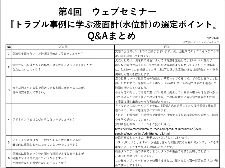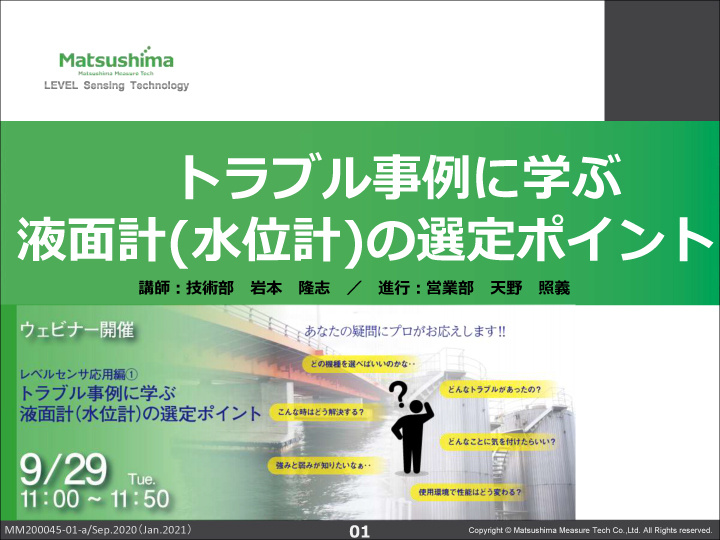 こちらは第4回ウェビナー「レベルセンサ応用編~トラブル事例に学ぶ液面計(水位計)選定のポイント~」を編集した動画です。ウェビナー発表資料やQ&Aリストもダウンロードいただけます。